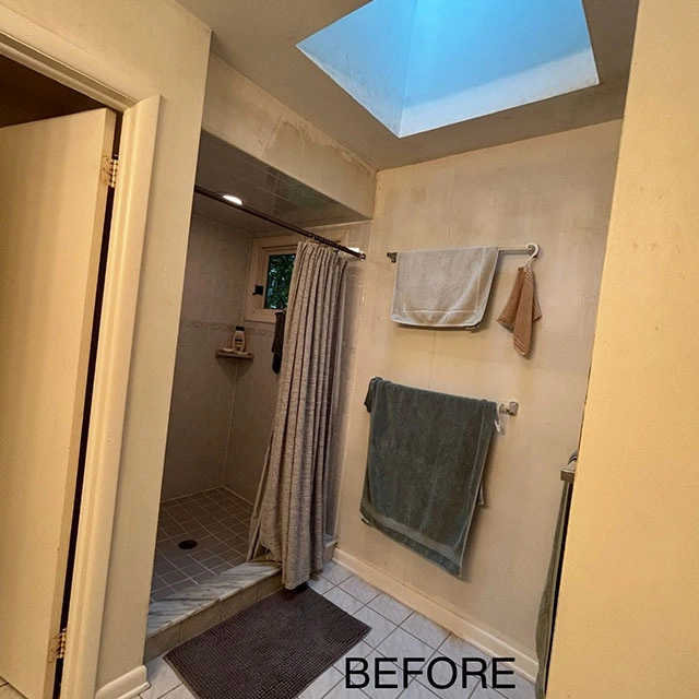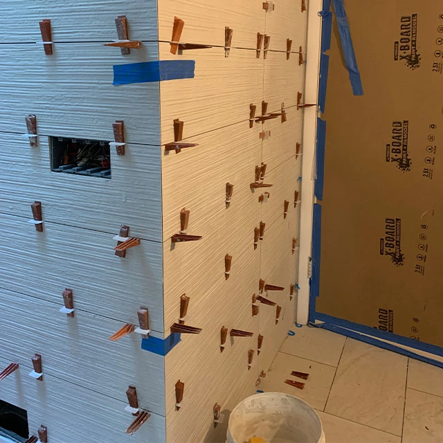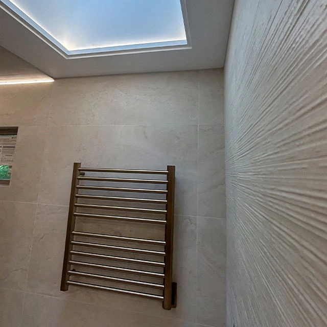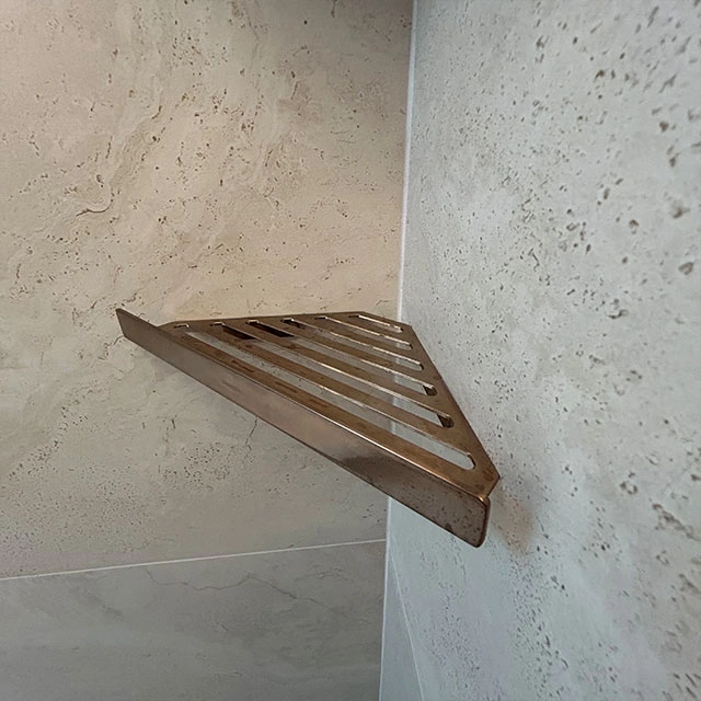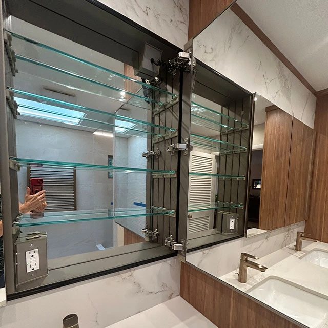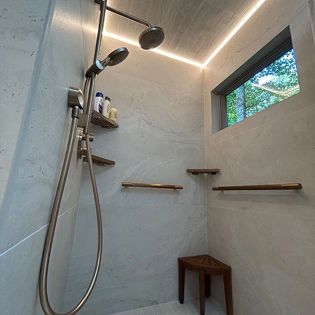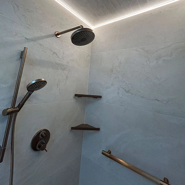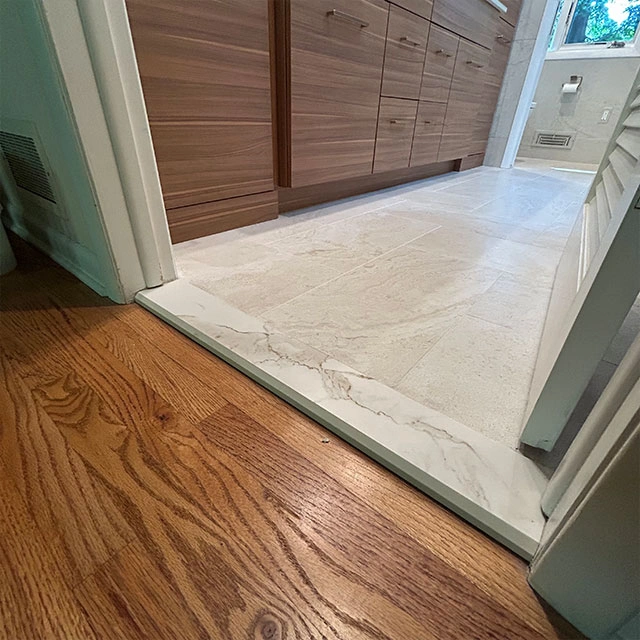 Cabinet Style – Style – Metropolitan – tfl- Arizona Cypress Slab | Countertop – Dekton- Enzo Porcelain | Hardware – Hardware Resources- Gibson Collection – Satin Bronze | Tile – Wall and Floor tile – Provenza Minimal White